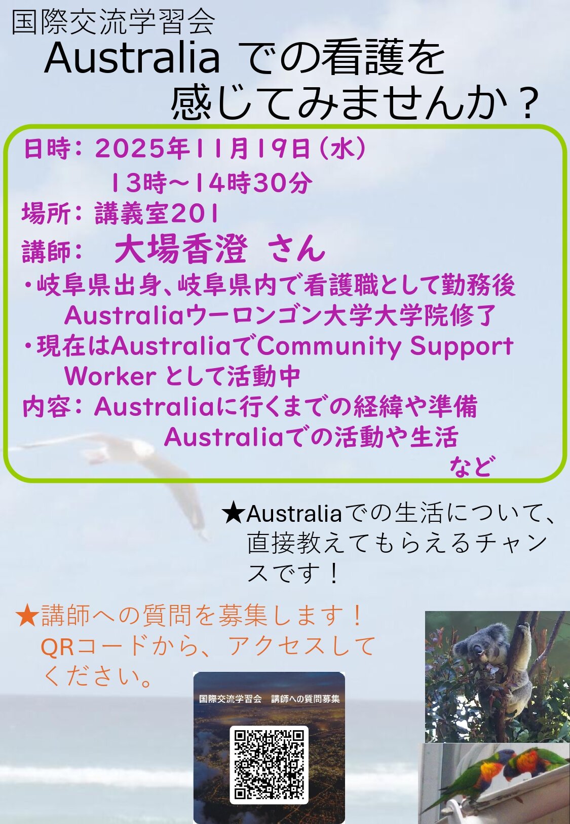 学習会では、現在オーストラリアでCommunity Support Worker として活動中の講師より、オーストラリアに行くまでの経緯や準備、オーストラリアでの活動や生活についてお話しいただきました。