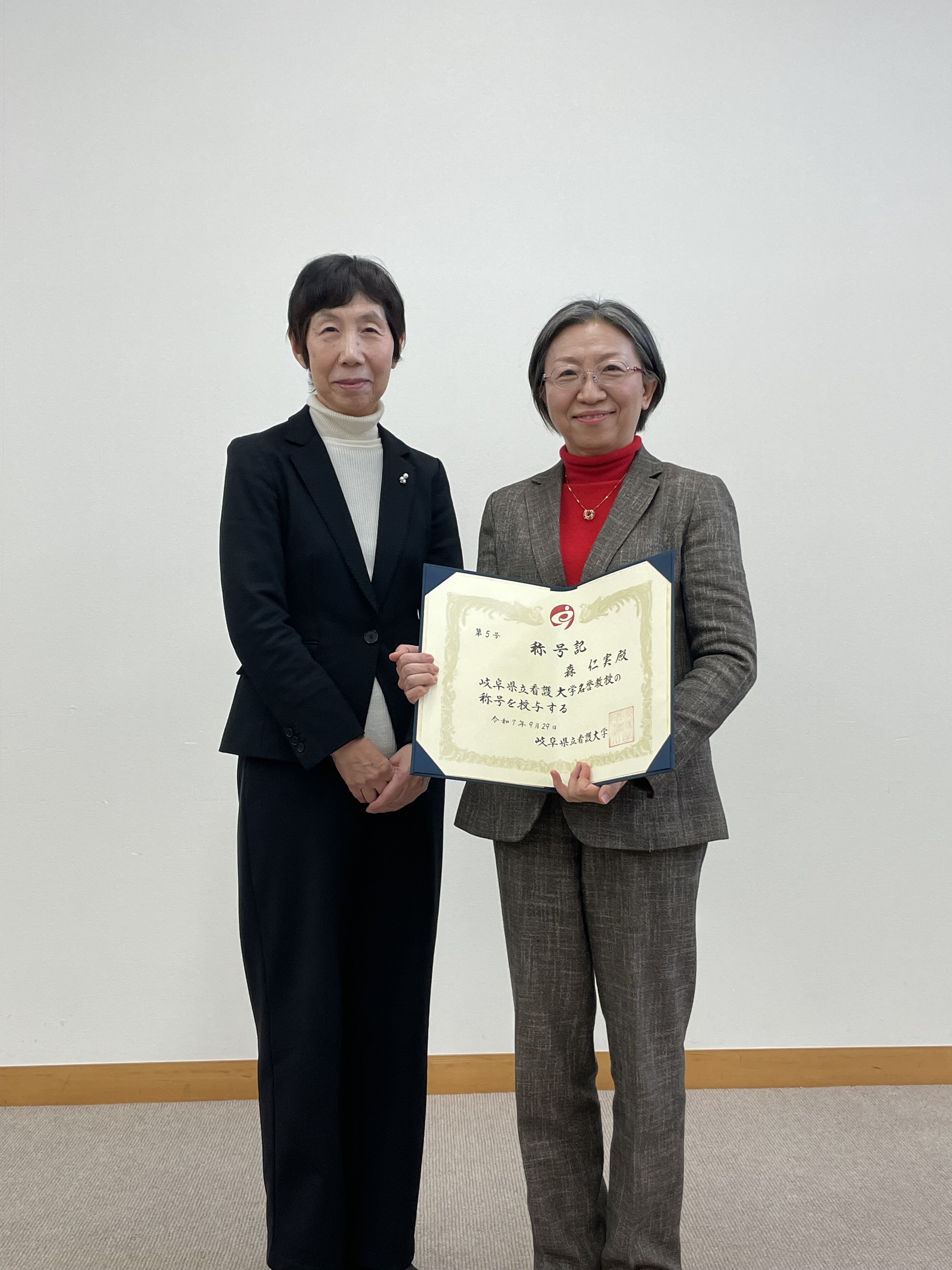 2026年1月23日(金)に名誉教授の称号授与式を挙行し、森仁実先生に名誉教授の称号が授与されました。授与式では、北山学長より森先生に称号記が手渡され、これまでの教育及び学術上の功績に敬意を表すとともに、本学への貢献に対して感謝の言葉が贈られました。